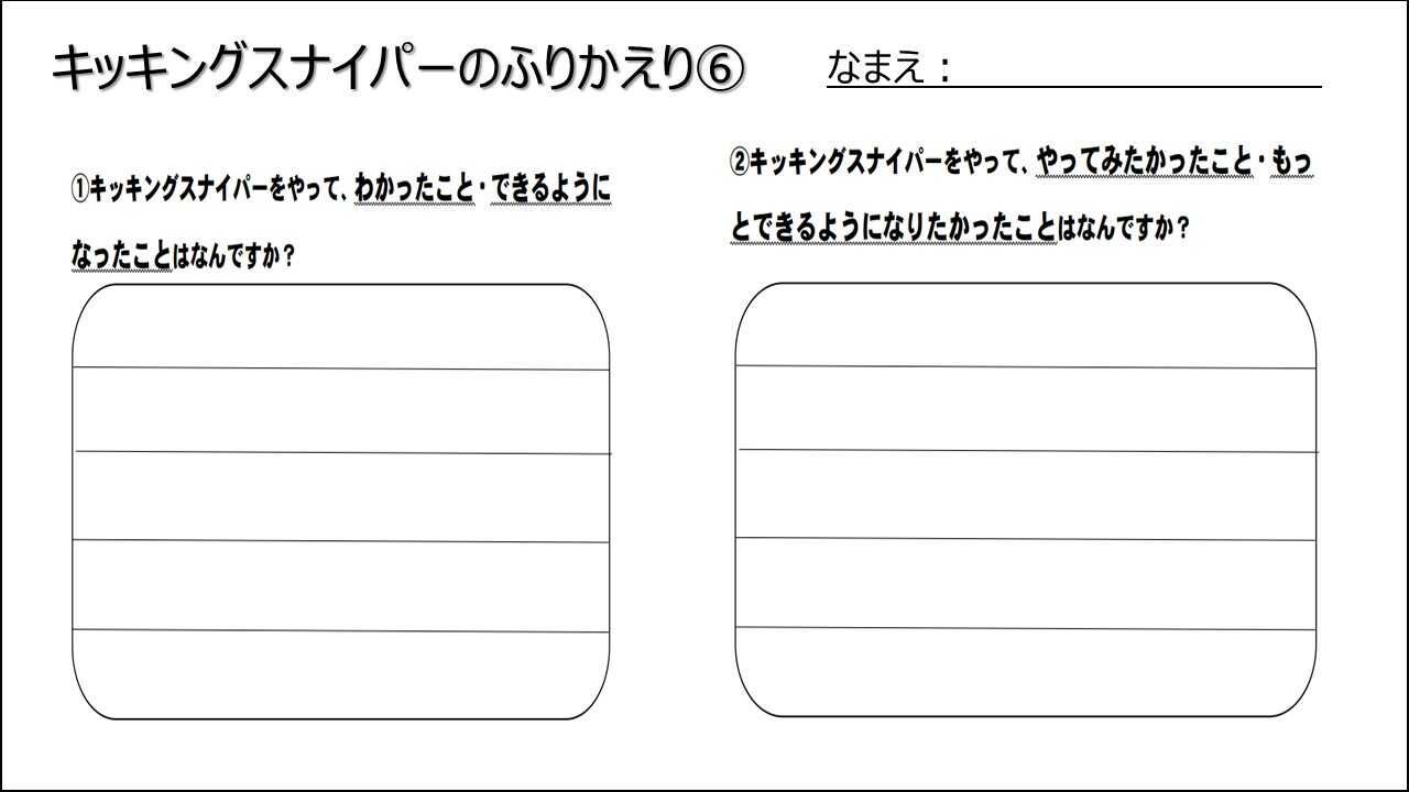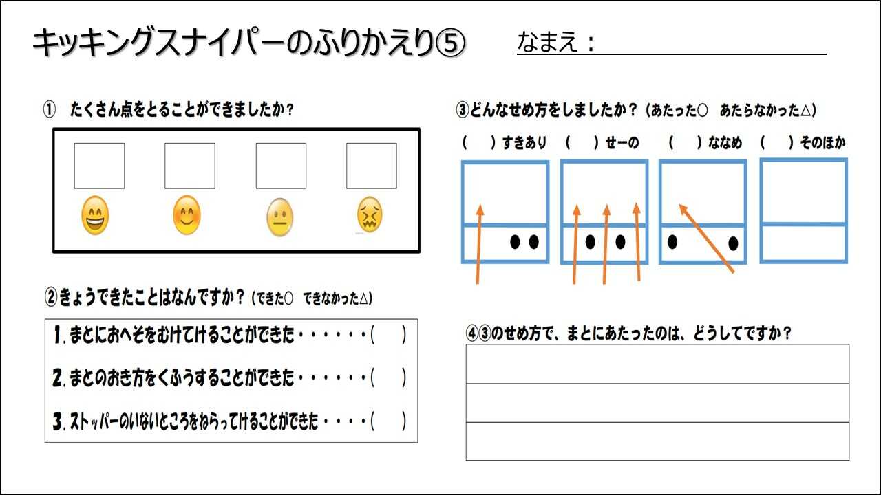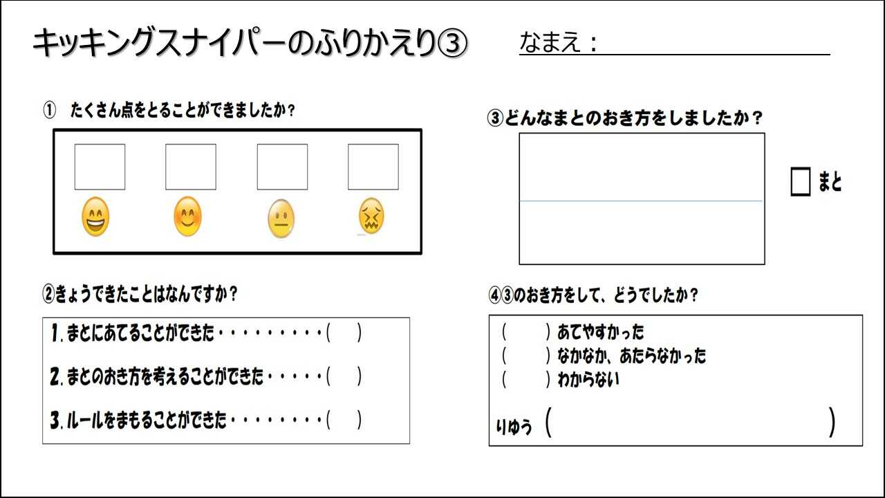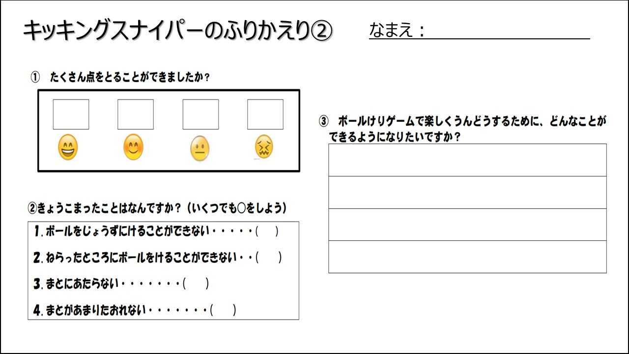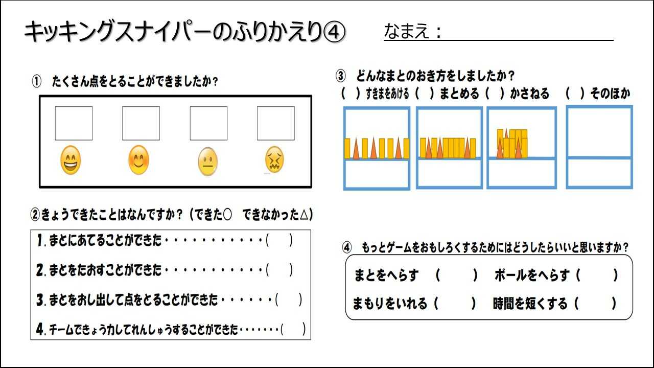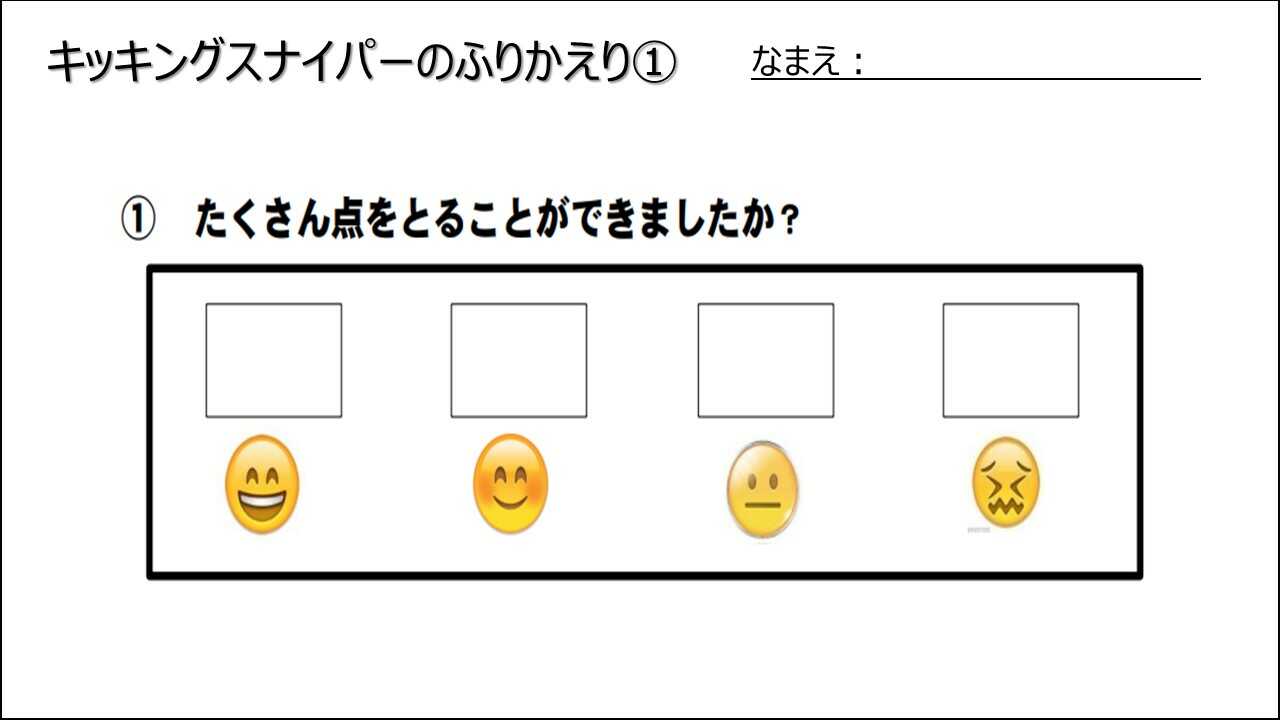 どんな置き方をして結果どうだったか?キッキングスナイパーを楽しく運動するにはどんなことができるようになりたいか?もっとゲームをおもしろくするためにはどうしたらいいか?
