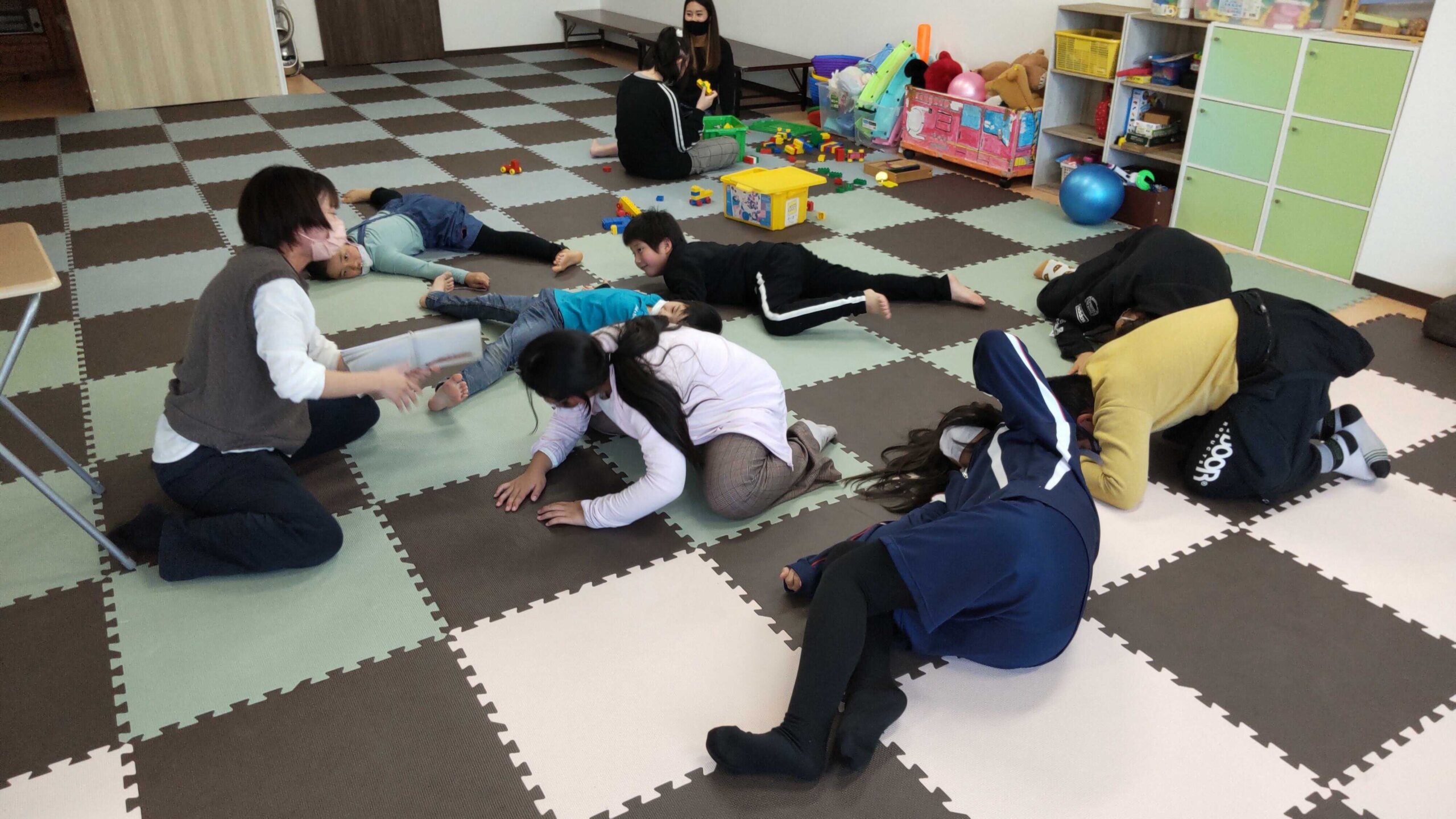 - 「だるまさんが」では、体全体で絵本の世界を表現して遊んだ。「だ、る、ま、さ、ん、が」という言葉から次の動作へと繋がる展開だが、繰り返しのため分かりやすく、指導員が動かずとも、子どもたちが次の展開を読み、先に体を動かす様子が見られた。様々な特性をもつ子どもたちにとって、「繰り返し」というのは分かりやすく、また、安心できる材料であることが再確認できた。