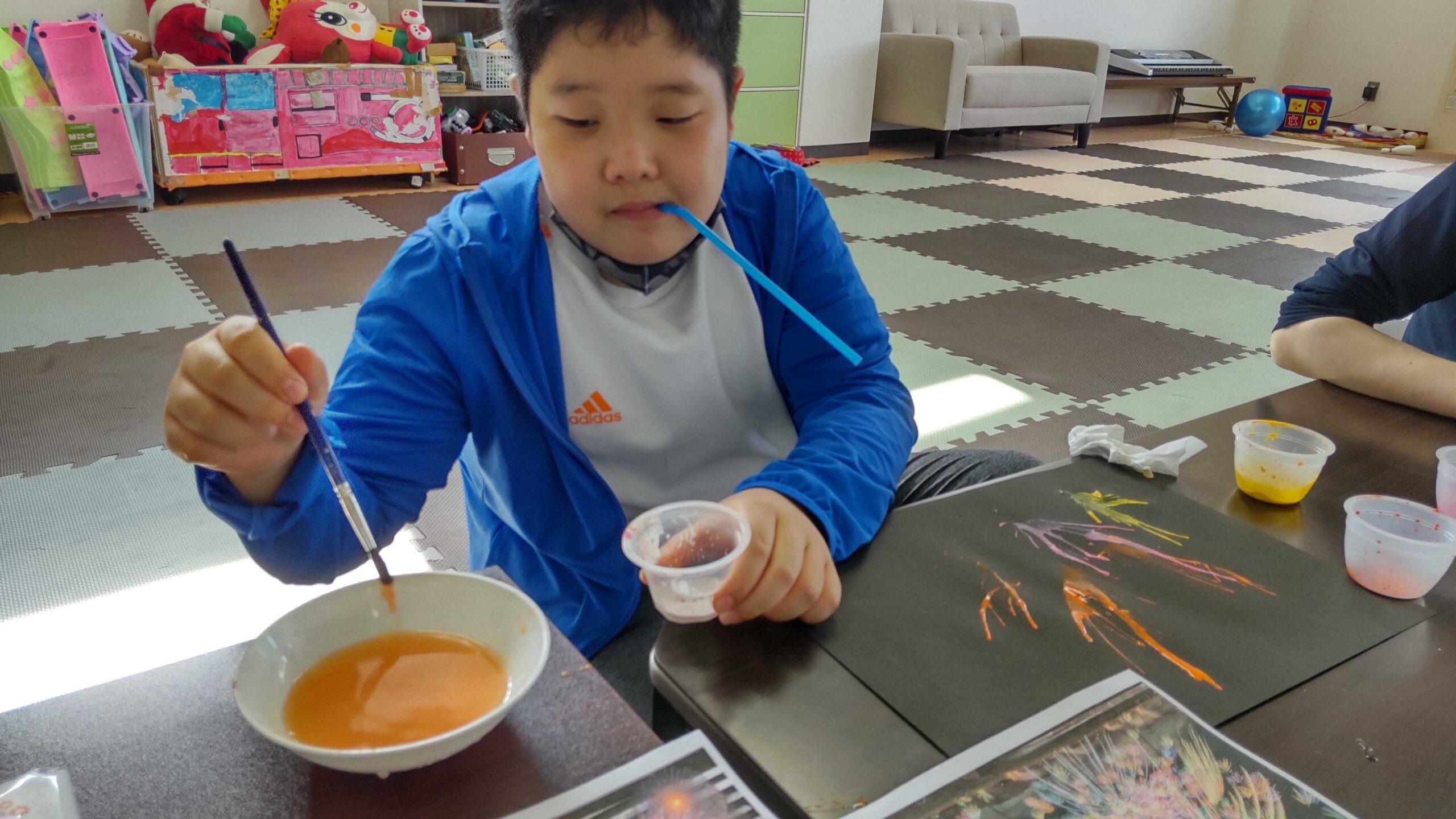 絵具を垂らしてストローで吹いたり、手でスタンピングしながら花火を表現しています。