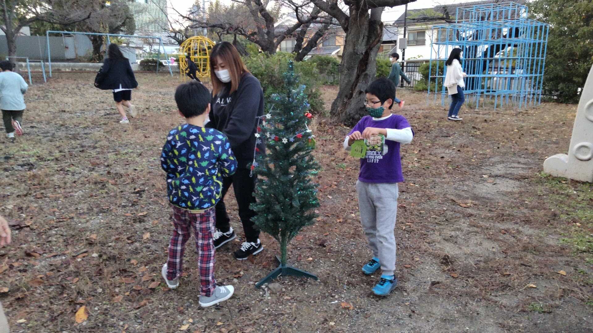 もみの木ごと公園に持って行き、あらかじめ公園に隠しておいたオーナメントを、自分の力(友達との連携も可)で探し出していきます。